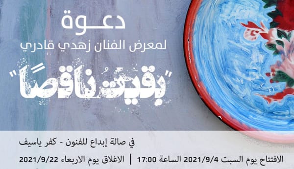 بقلم: نادره شحاده تصوير سلام دياب افتتحت جمعية ابداع يوم السّبت 4/9/2021 معرضا للفنّان التّشكيليّ زهدي قادري في صالة العرض إبداع في كفرياسيف ، تحت عنوان ” وبقيت ناقصًا ” ،  وسط أجواء افتتاحية جميلة وحضور ملفت ومميز من الوسطين العربي واليهودي برعاية رئيس مجلس كفرياسيف المحلّي المحامي شادي شويري ومن تنظيم الفنان سلام ذياب